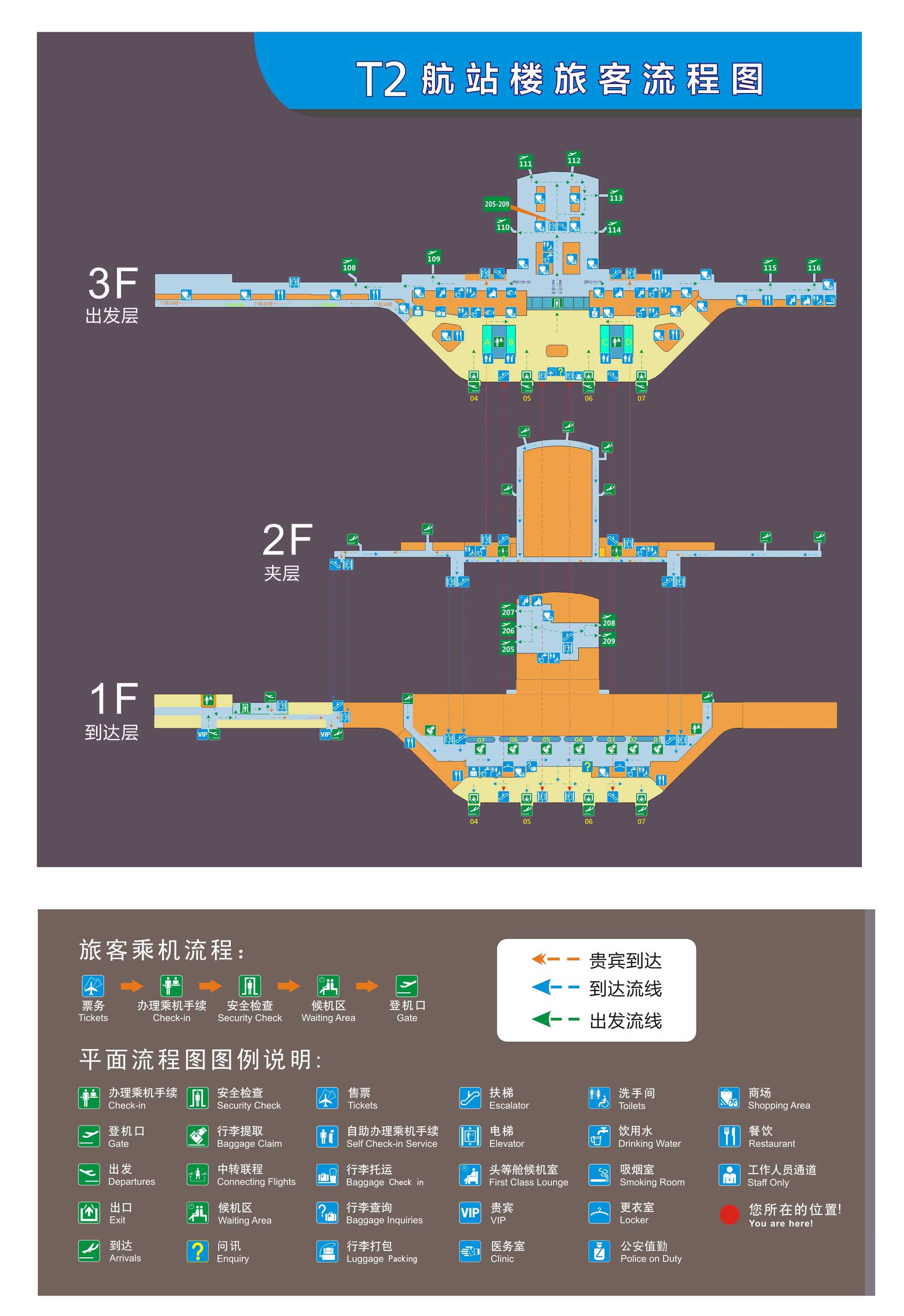 | 中转区域 | 中转值机柜台(无行李托运) | T2航展楼夹层内 |