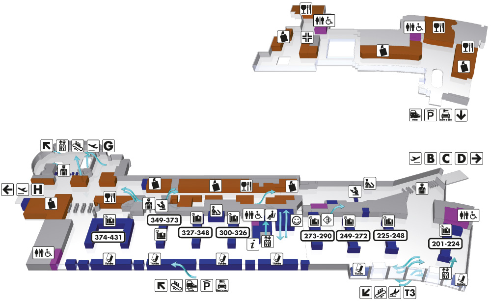 中转柜台位于出发与到达夹层内,旅客下机后首先进入夹层后进入到达厅。