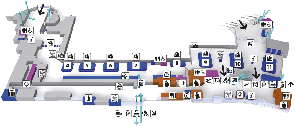 国内航班在A区共设有3个廊桥登机口和1个远机位登机口。国际、地区航班在B区共设有2个廊桥登机口。